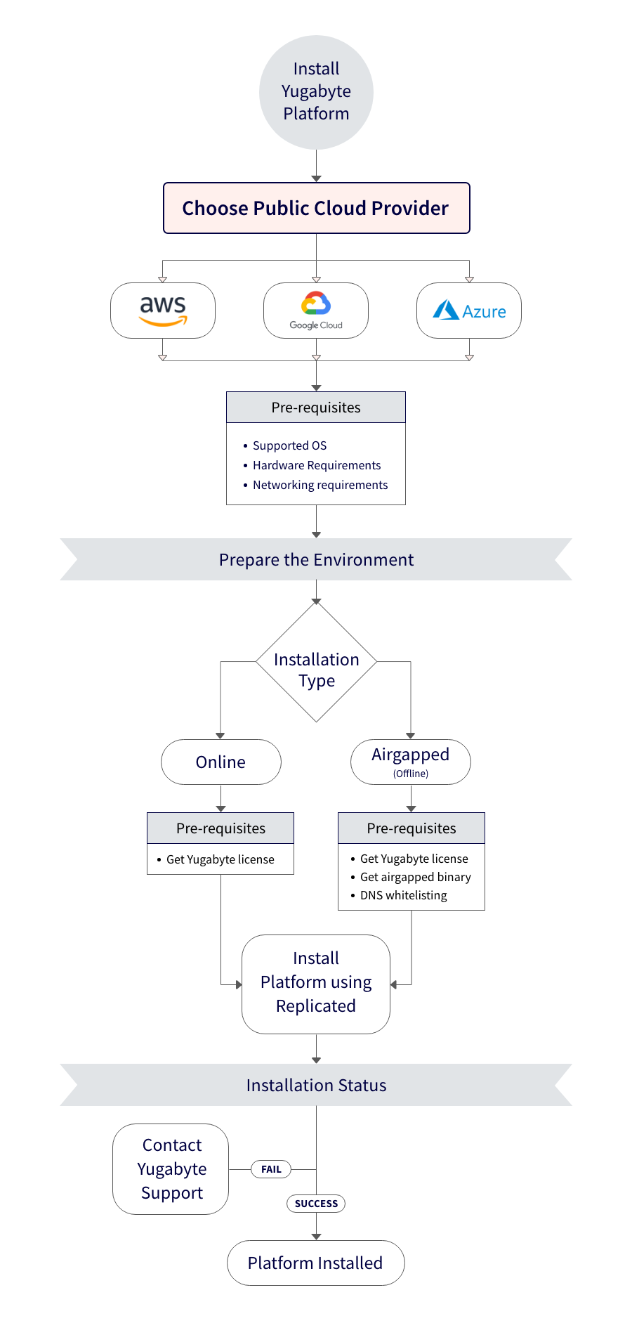 Install YugabyteDB Anywhere AWS prep environment GCP prep environment Azure prep environment Pre reqs platform Online installation Airgapped installation